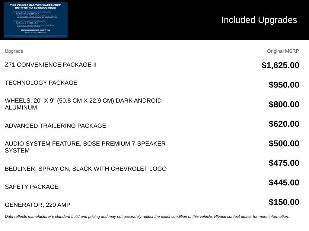 We look forward to serving you! Advanced Trailering Package (Trailering App), Heavy-Duty Trailering Package (Integrated Trailer Brake Controller), Preferred Equipment Group 4Z7 (Automatic Emergency Braking, Chevy Safety Assist, Electronic Automatic Cruise Control, Following Distance Indicator, Forward Collision Alert, Front Pedestrian & Bicyclist Braking, IntelliBeam Automatic High Beam On/Off, Lane Keep Assist w/Lane Departure Warning, and Rear-Window Electric Defogger), Safety Package (Rear Cross Traffic Braking and Rear Park Assist), Technology Package (Adaptive Cruise Control, HD Surround Vision, and Rear Pedestrian Alert), Z71 Convenience Package II (8-Way Power Driver Seat Adjuster, Dual-Zone Automatic Air Conditioning, EZ-Lift & Lower Tailgate, Heated Driver & Front Passenger Seats, Inside Rear-View Auto-Dimming Mirror, Power Driver Lumbar Control Seat Adjuster, Remote Vehicle Starter System, StowFlex Tailgate Storage Compartment, Tailgate Keyed Cylinder Lock, Tilt & Telescoping Steering Column, and Wireless Charging), Chevrolet Certified Pre-Owned Certified, 4WD, 220 Amp Generator, 3.42 Rear Axle Ratio, 4-Way Manual Passenger Seat Adjuster, 4-Wheel Disc Brakes, 6 Speakers, 6-Speaker Audio System Feature, 6-Way Manual Driver Seat Adjuster, ABS brakes, Air Conditioning, Alloy wheels, AM/FM radio: SiriusXM, Apple CarPlay/Android Auto, Auto High-beam Headlights, Black Spray-On Bedliner w/Chevrolet Logo, Blind Zone Steering Assist w/Trailering, Bose Premium 7-Speaker Audio System Feature, Brake assist, Bumpers: body-color, Cloth/Evotex Seat Trim, Compass, Delay-off headlights, Driver door bin, Driver vanity mirror, Dual front impact airbags, Dual front side impact airbags, Electronic Stability Control, Front anti-roll bar, Front Bucket Seats, Front Center Armrest, Front fog lights, Front License Plate Kit, Front Passenger Seatback Map Pocket, Front reading lights, Front wheel independent suspension, Heated door mirrors, Illuminated entry, Low tire pressure warning, Navigation System, Occupant sensing airbag, Outside temperature display, Overhead airbag, Overhead console, Panic alarm, Passenger door bin, Passenger vanity mirror, Power door mirrors, Power steering, Power windows, Radio data system, Radio: 11.3" Diagonal Advanced Color LCD Display, Rear reading lights, Rear step bumper, Rear window defroster, Remote keyless entry, Security system, SiriusXM Radio, Speed control, Speed-sensing steering, Split folding rear seat, Steering Wheel Mounted Audio Controls, Steering wheel mounted audio controls, Tachometer, Tilt steering wheel, Traction control, Trip computer, Variably intermittent wipers, Wheels: 18" x 8.5" Android Dark Full Gloss Aluminum, Wheels: 20" x 9" Dark Android Aluminum, and Wireless Phone ProjectioN.