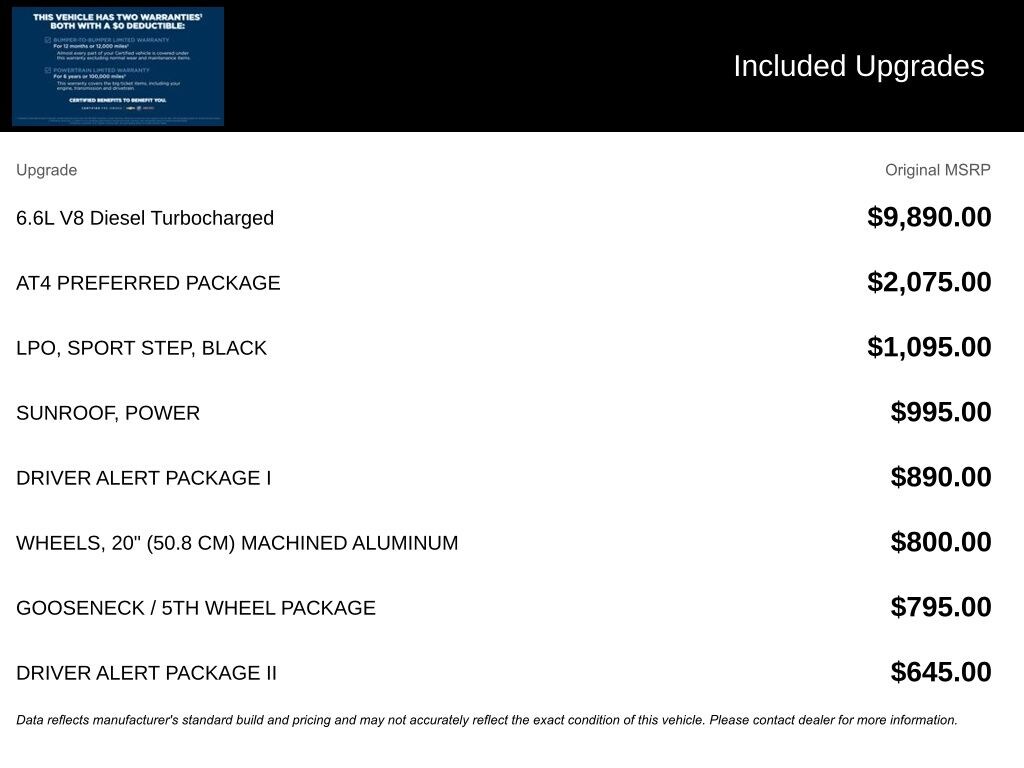 We look forward to serving you! AT4 Preferred Package (Bed View Camera w/2 Trailer Camera Provisions, Bose Premium 7 Speaker Sound System, HD Surround Vision w/2 Trailer View Camera Provisions, Hitch Guidance w/Hitch View, LED Smoked Amber Roof Marker Lamps, Power Sliding Rear Window w/Defogger, Radio: AM/FM w/Prem GMC Infotainment System & Navi, Universal Home Remote, and Wireless Charging), Driver Alert Package I (Lane Change Alert w/Side Blind Zone Alert, Perimeter Lighting, Rear Cross Traffic Alert, and Ultrasonic Front & Rear Park Assist), Driver Alert Package II (Automatic Emergency Braking, Following Distance Indicator, Forward Collision Alert, IntelliBeam Automatic High Beam On/Off, Lane Departure Warning System, and Safety Alert Seat), Gooseneck/5th Wheel Package, Gooseneck/5th Wheel Prep Package, Preferred Equipment Group 4SB (12-Volt Rear Auxiliary Power Outlet, 120-Volt Bed Mounted Power Outlet, 120-Volt Instrument Panel Power Outlet, 2 USB Ports (First Row), 2 USB Ports Inside Console, 2-Speed Active Transfer Case, 2nd Row Dual USB Charge-Only Ports, 4.2" Diagonal Color Display Driver Info Center, Compass Located In Instrument Cluster, Deep-Tinted Glass, Electric Rear-Window Defogger, Electrical Lock Control Steering Column, Floor-Mounted Center Console, GMC Connected Access Capable, HD Rear Vision Camera, Heated 2nd Row Outboard Seats, Heated Driver & Front Outboard Passenger Seats, In-Vehicle Trailering System App, Integrated Trailer Brake Controller, Keyless Open & Start, LED Cargo Area Lighting, Manual Tilt-Wheel/Telescoping Steering Column, OnStar & GMC Connected Services Capable, Painted Blk Surround Grille w/High Gloss Blk Mesh, Power Door Locks, Power Front Passenger Windows w/Express Up/Down, Power Front Windows w/Driver Express Up/Down, Power Rear Windows w/Express Down, Prem Front Floor Liners w/Removable Carpet Insert, Prem Rear Floor Liners w/Removable Carpet Insert, ProGrade Trailering System, Rear Wheelhouse Liners, Red Recovery Hooks, Remote Vehicle Starter System, Spray-On Pickup Bed Liner w/AT4 Logo, Steering Wheel Audio Controls, Unauthorized Entry Theft-Deterrent System, Ventilated Driver & Front Passenger Seats, Wi-Fi Hotspot Capable, and Wireless Phone Projection), Snow Plow Prep/Camper Package (220 Amp Alternator), X31 Off-Road Package (Hill Descent Control), GMC Certified Pre-Owned Certified, 10-Speed Automatic, 4WD, Jet Black With Kalahari Accents Leather, 10-Way Power Driver Seat Adjuster w/Lumbar, 10-Way Power Passenger Seat Adjuster w/Lumbar, 18" Machined Aluminum Wheels, 20" Machined Aluminum Wheels, 4-Wheel Disc Brakes, 6 Speakers, 6-Speaker Audio System Feature, ABS brakes, Air Conditioning, Alloy wheels, AM/FM radio: SiriusXM with 360L, Apple CarPlay/Android Auto, Auto-dimming door mirrors, Auto-dimming Rear-View mirror, Automatic temperature control, Black Sport Step (LPO), Brake assist, Bumpers: body-color, Compass, Delay-off headlights, Driver door bin, Driver Memo
