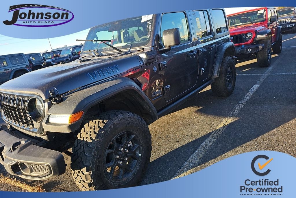 We look forward to serving you! Quick Order Package 29W Willys 4xe (4-Wheel Drive Swing Gate Decal, 4.10 Rear Axle Ratio, 7 & 4 Pin Wiring Harness, 97 MPH Vehicle Max Speed Calibration, Auxiliary Switches, Black Grille, Class II Receiver Hitch, Conventional Differential Front Axle, E-Locker Rear Axle, Front LED Fog Lamps, LED Premium Reflector Headlamps, Molded in Color Rubicon Highline Flare, MOPAR All-Weather Floor Mats, Off-Road Plus Mode, Wheels: 17" x 7.5" Painted Black, Willy's Suspension, and Willys 4xe Hood Decal), FCA US LLC Certified Pre-Owned Certified, 2.0L I4 DOHC, 3.73 Rear Axle Ratio, 4-Wheel Disc Brakes, 8 Speakers, ABS brakes, Air Conditioning, Alloy wheels, AM/FM radio: SiriusXM, Apple CarPlay/Android Auto, Black 3-Piece Hard Top, Brake assist, Cloth Low-Back Bucket Seats, Compass, Delay-off headlights, Driver door bin, Driver vanity mirror, Dual front impact airbags, Dual front side impact airbags, Electronic Stability Control, Freedom Panel Storage Bag, Front anti-roll bar, Front Bucket Seats, Front Center Armrest w/Storage, Front fog lights, Front License Plate Bracket (DISC), Front reading lights, Fully automatic headlights, Heated door mirrors, Illuminated entry, Integrated roll-over protection, Low tire pressure warning, Occupant sensing airbag, Outside temperature display, Overhead airbag, Panic alarm, ParkView Rear Back-Up Camera, Passenger door bin, Passenger vanity mirror, Power door mirrors, Power steering, Power windows, Radio data system, Radio: Uconnect 5 w/12.3" Display, Rear anti-roll bar, Rear reading lights, Rear Window Defroster, Rear Window Wiper/Washer, Remote keyless entry, Security system, Speed control, Split folding rear seat, Sport Suspension, Steering wheel mounted audio controls, Tachometer, Telescoping steering wheel, Tilt steering wheel, Traction control, Trip computer, Variably intermittent wipers, Voltmeter, and Wheels: 20" x 8" Machined/Painted GraY.