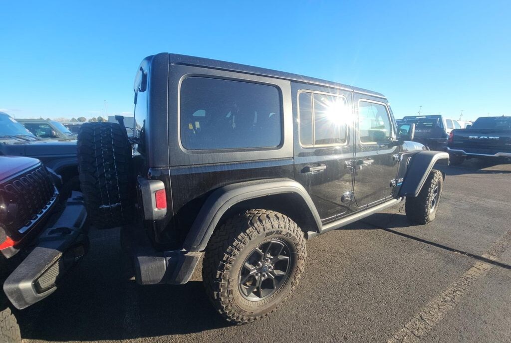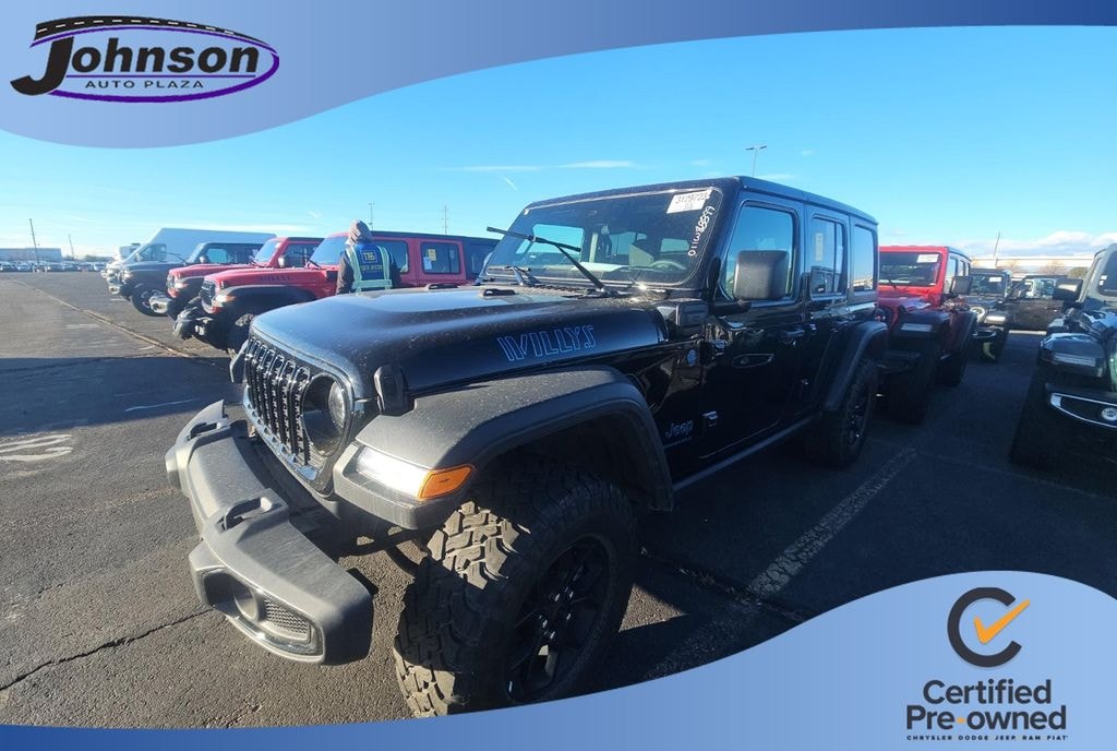 We look forward to serving you! Quick Order Package 29W Willys 4xe (4-Wheel Drive Swing Gate Decal, 4.10 Rear Axle Ratio, 7 & 4 Pin Wiring Harness, 97 MPH Vehicle Max Speed Calibration, Auxiliary Switches, Black Grille, Class II Receiver Hitch, Conventional Differential Front Axle, E-Locker Rear Axle, Front LED Fog Lamps, LED Premium Reflector Headlamps, Molded in Color Rubicon Highline Flare, MOPAR All-Weather Floor Mats, Off-Road Plus Mode, Wheels: 17" x 7.5" Painted Black, Willy's Suspension, and Willys 4xe Hood Decal), FCA US LLC Certified Pre-Owned Certified, 2.0L I4 DOHC, 3.73 Rear Axle Ratio, 4-Wheel Disc Brakes, 8 Speakers, ABS brakes, Air Conditioning, Alloy wheels, AM/FM radio: SiriusXM, Apple CarPlay/Android Auto, Black 3-Piece Hard Top, Brake assist, Cloth Low-Back Bucket Seats, Compass, Delay-off headlights, Driver door bin, Driver vanity mirror, Dual front impact airbags, Dual front side impact airbags, Electronic Stability Control, Freedom Panel Storage Bag, Front anti-roll bar, Front Bucket Seats, Front Center Armrest w/Storage, Front fog lights, Front License Plate Bracket (DISC), Front reading lights, Fully automatic headlights, Heated door mirrors, Illuminated entry, Integrated roll-over protection, Low tire pressure warning, Occupant sensing airbag, Outside temperature display, Overhead airbag, Panic alarm, ParkView Rear Back-Up Camera, Passenger door bin, Passenger vanity mirror, Power door mirrors, Power steering, Power windows, Radio data system, Radio: Uconnect 5 w/12.3" Display, Rear anti-roll bar, Rear reading lights, Rear Window Defroster, Rear Window Wiper/Washer, Remote keyless entry, Security system, Speed control, Split folding rear seat, Sport Suspension, Steering wheel mounted audio controls, Tachometer, Telescoping steering wheel, Tilt steering wheel, Traction control, Trip computer, Variably intermittent wipers, Voltmeter, and Wheels: 20" x 8" Machined/Painted GraY.