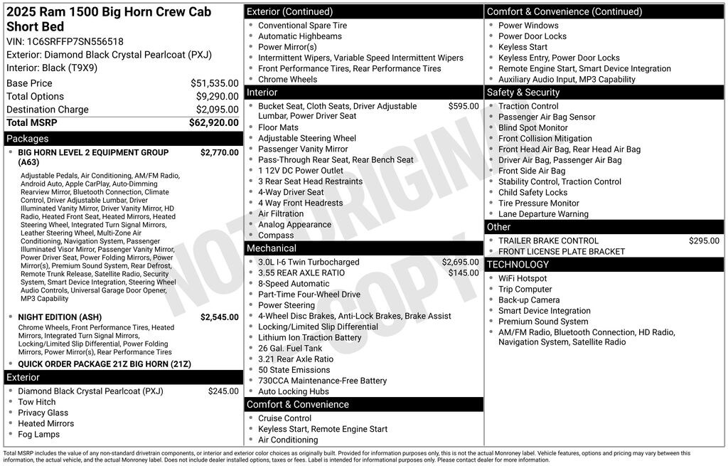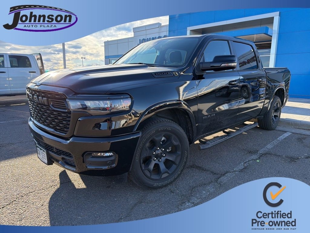 We look forward to serving you! Big Horn Level 2 Equipment Group (115V Auxiliary Power Outlet, 115V Auxiliary Rear Power Outlet, 12" Touchscreen Display, 2nd Row In Floor Storage Bins, 400W Inverter, 4G LTE Wi-Fi Hot Spot, 9 Amplified Speakers w/Subwoofer, Air Conditioning ATC w/Dual Zone Control, Apple CarPlay, Auto Power-Folding Mirrors, Auto-Dimming Exterior Driver Mirror, Auto-Dimming Rear-View Mirror, Black Exterior Mirrors, Black Premium Power Mirrors, Cluster 7.0" TFT Color Display, Configurable Drive Mode, Connected Travel & Traffic Services, Connectivity - US/Canada, Convex Wide-Angle Exterior Mirror Insert, Exterior Mirrors Courtesy Lamps, Exterior Mirrors w/Heating Element, Exterior Mirrors w/Supplemental Signals, Glove Box Lamp, Google Android Auto, GPS Antenna Input, GPS Navigation, HD Radio, Heated Front Seats, Heated Steering Wheel, Integrated Voice Command w/Bluetooth, Leather Wrapped Steering Wheel, LED Dome Lamp w/On/Off Switch, LED Footwell Lighting, Media Hub w/2 Charge Only USBs, Overhead LED Lamps, Power 2-Way Driver Lumbar Adjust, Power Adjust 8-Way Driver Seat, Power Adjustable Pedals, Premium Overhead Console, Radio: Uconnect 5 Nav w/12.0" Display, Rear Power Sliding Window, Rear Window Defroster, Remote Tailgate Release, Security Alarm, SiriusXM w/360L, Steering Wheel Mounted Audio Controls, Sun Visors w/Illuminated Vanity Mirrors, Universal Garage Door Opener, and USB Host Flip), Night Edition (3 Rear Seat Head Restraints, 4 Way Front Headrests, Accent Color Door Handles, Accent Color Premium Power Mirrors, Accent Color Tailgate Handle, Anti-Spin Differential Rear Axle, Black Exterior Truck Badging, Black Headlamp Bezels, Black Interior Accents, Black Painted Exterior Mirrors Caps, Black Tail Lamp Bezels, Body Color Front Bumper, Body Color Rear Bumper w/Step Pads, Bucket Seats, Deluxe Cloth Bucket Seats, Front Seat Back Map Pockets, Full Length Floor Console, Grille Black Surround Black Mesh, Manual Adjust 4-Way Front Passenger Seat, RAM Grille Badge - Black, Rear 60/40 Folding Seat, Rear Center Armrest, and Wheels: 20" x 9.0" Aluminum Painted Clad), Quick Order Package 21Z Big Horn, FCA US LLC Certified Pre-Owned Certified, 4-Wheel Disc Brakes, 6 Speakers, ABS brakes, Air Conditioning, Alloy wheels, AM/FM radio, Apple CarPlay/Android Auto, Auto High-beam Headlights, Brake assist, Bumpers: chrome, Cloth Bench Seat, Compass, Delay-off headlights, Driver door bin, Dual front impact airbags, Dual front side impact airbags, Electronic Stability Control, Front anti-roll bar, Front Center Armrest w/Storage, Front fog lights, Front License Plate Bracket, Front reading lights, Front wheel independent suspension, Fully automatic headlights, Heated door mirrors, Illuminated entry, Low tire pressure warning, Manual Folding Exterior Mirrors, Occupant sensing airbag, Outside temperature display, Overhead airbag, Overhead console, Panic alarm, ParkView Rear Back-Up Camera, Passenger door bin, Passenger vanity mirror, Power door mirror