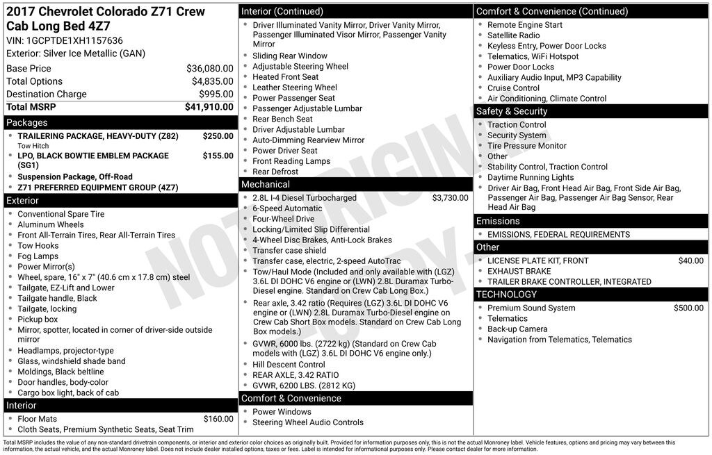 We look forward to serving you! Black Bowtie Emblem Package (LPO), Heavy-Duty Trailering Package, Preferred Equipment Group 4Z7, 4WD, 3.42 Rear Axle Ratio, 4-Way Power Front Passenger Seat Adjuster, 4-Wheel Disc Brakes, 6 Speakers, 6-Speaker Audio System Feature, ABS brakes, Air Conditioning, All-Weather Floor Mats, Alloy wheels, AM/FM radio: SiriusXM, Apple CarPlay, Auto-dimming Rear-View mirror, Automatic temperature control, Bose Premium 7-Speaker Audio System Feature, Bumpers: body-color, Cloth/Leatherette Seat Trim, Compass, Delay-off headlights, Driver 4-Way Power Seat Adjuster, Driver door bin, Driver vanity mirror, Dual front impact airbags, Dual front side impact airbags, Electronic Stability Control, Emergency communication system: OnStar Guidance, Exhaust Brake, Exterior Parking Camera Rear, Front anti-roll bar, Front Bucket Seats, Front Center Armrest, Front fog lights, Front License Plate Kit, Front reading lights, Front wheel independent suspension, Fully automatic headlights, Heated Driver & Front Passenger Seats, Heated front seats, Illuminated entry, Integrated Trailer Brake Controller, Low tire pressure warning, Occupant sensing airbag, Outside temperature display, Overhead airbag, Overhead console, Panic alarm, Passenger door bin, Passenger vanity mirror, Power door mirrors, Power Driver Lumbar Control Seat Adjuster, Power driver seat, Power Passenger Lumbar Control Seat Adjuster, Power passenger seat, Power steering, Power windows, Premium audio system: Chevrolet MyLink, Radio data system, Radio: AM/FM Stereo w/8" Diagonal Color Touch Screen, Rear reading lights, Rear seat center armrest, Rear step bumper, Rear window defroster, Remote keyless entry, Security system, SiriusXM Satellite Radio, Speed control, Speed-sensing steering, Steering wheel mounted audio controls, Tachometer, Telescoping steering wheel, Tilt steering wheel, Traction control, Trip computer, Variably intermittent wipers, and Wheels: 17" x 8" Dark Argent Metallic Cast AlloY.