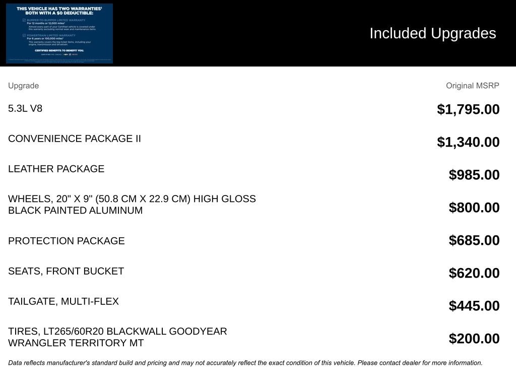 We look forward to serving you! Convenience Package (10-Way Power Driver Seat w/Lumbar, 120-Volt Bed Mounted Power Outlet, 120-Volt Interior Power Outlet, Dual Rear USB Ports (Charge Only), Dual-Zone Automatic Climate Control, Electric Rear-Window Defogger, Heated Driver & Front Outboard Passenger Seats, Heated Steering Wheel, Keyless Open & Start, Remote Vehicle Starter System, Theft Deterrent System (Unauthorized Entry), and Wrapped Steering Wheel), Convenience Package II (Hitch Guidance w/Hitch View, In-Vehicle Trailering System App, Integrated Trailer Brake Controller, Power Sliding Rear Window w/Rear Defogger, Premium Bose 7-Speaker Sound System, and Universal Home Remote), Leather Package (Leather-Appointed Front Seat Trim), Preferred Equipment Group 2LT (12.3" Multicolor Reconfigurable Digital Display, 6-Speaker Audio System, All-Weather Floor Liner (LPO) (AAK), Auto-Locking Rear Differential, Bluetooth® For Phone, Chevrolet Connected Access Capable, Color-Keyed Carpeting Floor Covering, Deep-Tinted Glass, Electrical Steering Column Lock, Electronic Cruise Control, EZ Lift Power Lock & Release Tailgate, Front LED Fog Lamps, HD Rear Vision Camera, Heated Power-Adjustable Outside Mirrors, High Gloss Black Mirror Caps, Inside Rear-View Mirror w/Tilt, LED Cargo Area Lighting, OnStar & Chevrolet Connected Services Capable, Performance Red Recovery Hooks, Power Front Windows w/Driver Express Up/Down, Power Front Windows w/Passenger Express Down, Power Rear Windows w/Express Down, Rear 60/40 Folding Bench Seat (Folds Up), SiriusXM w/360L, Standard Tailgate, Steering Wheel Audio Controls, and Wi-Fi Hot Spot Capable), Protection Package (Chevytec Spray-On Black Bedliner and Rear Wheelhouse Liners), Suspension Package (Heavy-Duty Air Filter and Hill Descent Control), Trailering Package (Hitch Guidance), Up-Level Rear Seat w/Storage Package, Chevrolet Certified Pre-Owned Certified, 10-Speed Automatic, 4WD, Black Leather, 170 Amp Alternator, 2 USB Data Ports, 220 Amp Alternator, 3.23 Rear Axle Ratio, 3.42 Rear Axle Ratio, 4-Wheel Disc Brakes, 40/20/40 Front Split-Bench Seat, 6 Speakers, ABS brakes, Air Conditioning, Alloy wheels, AM/FM radio: SiriusXM with 360L, Auto High-beam Headlights, Automatic Emergency Braking, Automatic temperature control, Auxiliary External Transmission Oil Cooler, Brake assist, Cloth Seat Trim, Compass, Delay-off headlights, Driver door bin, Driver vanity mirror, Dual Exhaust w/Polished Outlets, Dual front impact airbags, Dual front side impact airbags, Electronic Stability Control, Electronic Transmission Range Selector Shifter, External Engine Oil Cooler, Floor Mounted Center Console, Following Distance Indicator, Forward Collision Alert, Front anti-roll bar, Front Bucket Seats, Front Center Armrest w/Storage, Front dual zone A/C, Front fog lights, Front License Plate Kit, Front Pedestrian Braking, Front reading lights, Front wheel independent suspension, Fully automatic headlights, Heated door mi
