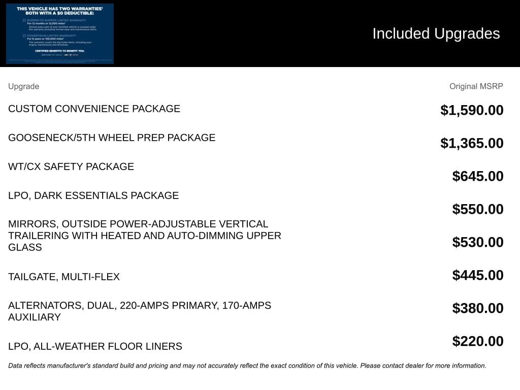 We look forward to serving you! Custom Convenience Package (10-Way Power Driver Seat Adjuster w/Lumbar, 120-Volt Bed Mounted Power Outlet, 120-Volt Interior Power Outlet, Dual Rear USB Ports (Charge Only), Electric Rear-Window Defogger, EZ Lift Power Lock & Release Tailgate, Integrated Trailer Brake Controller, LED Cargo Area Lighting, Remote Vehicle Starter System, and Unauthorized Entry Theft-Deterrent System), CX Safety Package (Lane Change Alert w/Side Blind Zone Alert, Rear Cross Traffic Alert, and Rear Park Assist), Dark Essentials Package (LPO) (Black Name Plates (LPO), Black Tailgate Lettering (LPO), and Front Black Bowtie Emblem (LPO)), Gooseneck/5th Wheel Package (DISC) (Black Chevytec Spray-On Bedliner), Gooseneck/5th Wheel Prep Package, Preferred Equipment Group 1CX (170 Amp Alternator, 2-Speed Electronic Shift Transfer Case, 3.5" Diagonal Monochromatic Display DIC, Black Mirror Caps, Bluetooth® For Phone, Chevrolet Connected Access Capable, Color-Keyed Carpeting Floor Covering, Compass, Deep-Tinted Glass, Electronic Cruise Control w/Set & Resume Speed, Front Rubberized Vinyl Floor Mats, HD Rear Vision Camera, Heated Vertical Trailering Mirrors, Locking Tailgate, Manual Tailgate Function w/No EZ Lift, Manual Tilt-Wheel Steering Column, OnStar & Chevrolet Connected Services Capable, Power Door Locks, Power Front Windows w/Driver Express Up/Down, Power Front Windows w/Passenger Express Down, Power Rear Windows w/Express Down, Push Button Start, Rear 60/40 Folding Bench Seat (Folds Up), Rear Rubberized Vinyl Floor Mats, Remote Keyless Entry, SiriusXM w/360L, Standard Tailgate, Wi-Fi Hotspot Capable, and Wireless Phone Projection), Suspension Package, Chevrolet Certified Pre-Owned Certified, 10-Speed Automatic, 4WD, Black Cloth, 3.73 Rear Axle Ratio, 4-Wheel Disc Brakes, 6 Speakers, 6-Speaker Audio System, 700 Cold-Cranking Amps/70 Amp-hr Auxiliary Battery, 720 Cold-Cranking Amps Heavy-Duty Battery, ABS brakes, Air Conditioning, All-Weather Floor Liners (LPO), Alloy wheels, AM/FM radio: SiriusXM with 360L, Apple CarPlay/Android Auto, Auto High-beam Headlights, Auto-Dimming Inside Rear-View Mirror, Brake assist, Cloth Seat Trim, Delay-off headlights, Driver door bin, Dual 220-Amp Primary/170-Amp Auxiliary Alternators, Dual front impact airbags, Dual front side impact airbags, Durabed Pickup Bed, Electronic Stability Control, Front 40/20/40 Split-Bench Seats w/Lockable Storage, Front anti-roll bar, Front Center Armrest w/Storage, Front License Plate Kit, Front reading lights, Front wheel independent suspension, Fully automatic headlights, Heated & Auto-Dimming Vertical Trailering Mirrors, Heated door mirrors, Illuminated entry, LED Smoked Amber Roof Marker Lamps, Low tire pressure warning, Multi-Flex Tailgate, Not Equipped w/Rear USB Ports, Occupant sensing airbag, Outside temperature display, Overhead airbag, Overhead console, Panic alarm, Passenger door bin, Passenger vanity mirror, Power door mirrors, Power steering, Power windows, Premium audio system: Chevrolet Infot