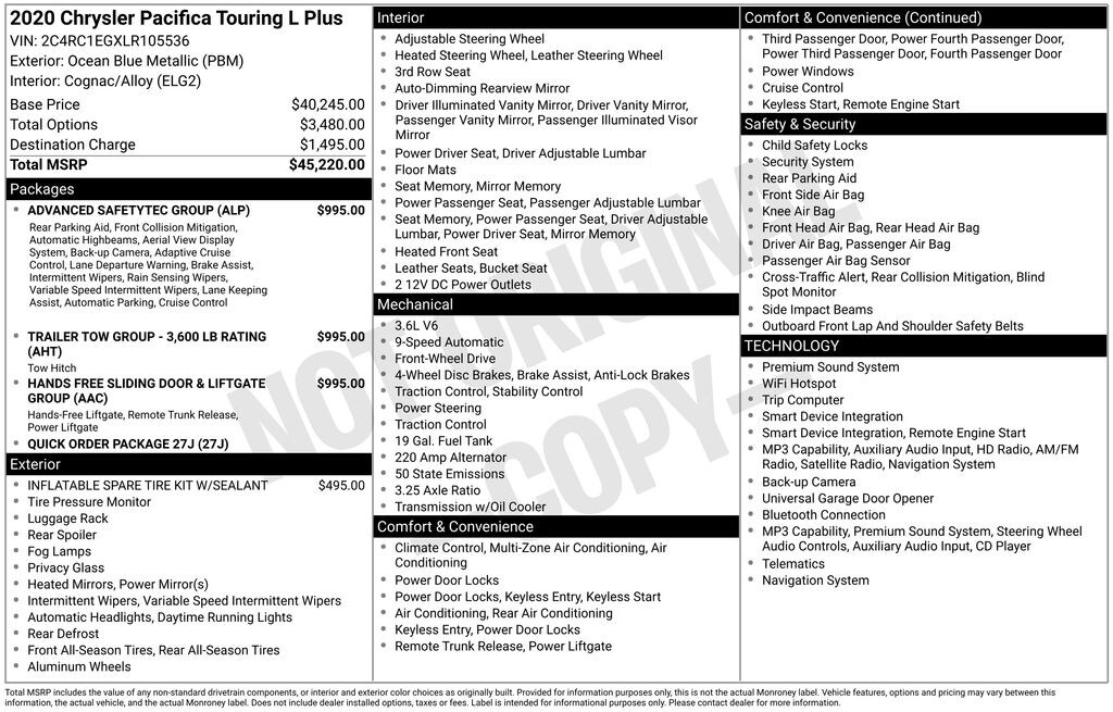We look forward to serving you! Advanced SafetyTec Group (360 Surround View Camera System, Adaptive Cruise Control w/Stop & Go, Advanced Brake Assist, Automatic High Beam Headlamp Control, Blind Spot & Rear Cross Path Detection, Full Speed Forward Collision Warning Plus, Lane Departure Warning Plus, Parallel & Perp Park Assist w/Stop, ParkSense Front/Rear Park Assist w/Stop, and Rain Sensitive Windshield Wipers), Hands Free Sliding Door & Liftgate Group (Hands Free Power Liftgate and Hands Free Sliding Doors), Inflatable Spare Tire Kit w/Sealant, Quick Order Package 27J, Trailer Tow Group - 3,600 lb Rating (7 & 4 Pin Trailer Tow Wiring Harness, Heavy-Duty Radiator, Hitch w/2" Receiver, and Trailer Sway Damping), 13 Speakers, 3.25 Axle Ratio, 3rd row seats: split-bench, 4-Wheel Disc Brakes, A/V remote, ABS brakes, Air Conditioning, Alloy Seats, Alloy wheels, AM/FM radio: SiriusXM, Apple CarPlay/Android Auto, Audio memory, Auto-dimming Rear-View mirror, Automatic temperature control, Bodyside moldings, Brake assist, Bumpers: body-color, CD player, Compass, Delay-off headlights, Driver door bin, Driver vanity mirror, Driver's Seat Mounted Armrest, Dual front impact airbags, Dual front side impact airbags, DVD-Audio, Electronic Stability Control, Emergency communication system: Uconnect Access, Four wheel independent suspension, Front anti-roll bar, Front Bucket Seats, Front dual zone A/C, Front Fascia Air Deflectors, Front fog lights, Front reading lights, Fully automatic headlights, Garage door transmitter, Headphones, Heated door mirrors, Heated front seats, Heated rear seats, Heated steering wheel, Illuminated entry, Knee airbag, Leather steering wheel, Low tire pressure warning, Memory seat, Navigation System, Occupant sensing airbag, Outside temperature display, Overhead airbag, Overhead console, Panic alarm, ParkView Rear Back-Up Camera, Passenger door bin, Passenger seat mounted armrest, Passenger vanity mirror, Perforated Leather Trim Bucket Seats, Power door mirrors, Power driver seat, Power Liftgate, Power passenger seat, Power steering, Power windows, Radio data system, Radio: Uconnect 4C Nav w/8.4" Display, Rear air conditioning, Rear reading lights, Rear window defroster, Rear window wiper, Reclining 3rd row seat, Remote keyless entry, Roof rack, Security system, Speed control, Split folding rear seat, Spoiler, Steering wheel mounted audio controls, Tachometer, Telescoping steering wheel, Tilt steering wheel, Touring Suspension, Traction control, Trip computer, Variably intermittent wipers, Voltmeter, Wheels: 17" x 7.0" Diamond Cut Aluminum, and Wheels: 17" x 7.0" Polished Aluminum (DISC)
