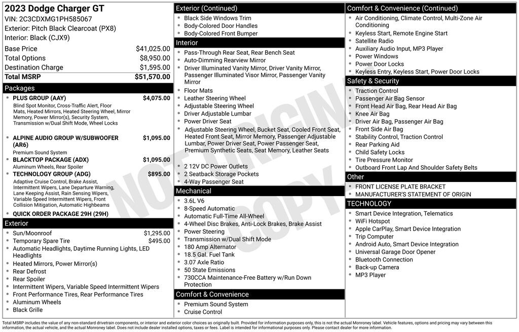 We look forward to serving you! Alpine Audio Group w/Subwoofer (506 Watt Amplifier, 9 Premium Alpine Speakers, Surround Sound, and Trunk Mounted Subwoofer), Blacktop Package (AWD Rhombi Black Badge, Black 1-Piece Performance Spoiler, Black Badge, Black Dodge Grille Badge, Gloss Black I/P Cluster Trim Rings, Rhombi 2-Pc Wheel Center Cap, Satin Black Charger Decklid Badge, Satin Black Dodge Tail Lamp Badge, and Wheels: 20" x 8" Black Noise AWD), Plus Group (Auto Adjust In Reverse Exterior Mirrors, Auto-Dimming Exterior Driver Mirror, Black-Edged Premium Floormats, Blind Spot & Cross Path Detection, Blind Spot Memory/Power/Heat Mirror, Deluxe Security Alarm, Driver & Passenger Lower LED Lamps, Exterior Mirrors Courtesy Lamps, Exterior Mirrors w/Heating Element, Front & Rear LED Map Pockets, Front Overhead LED Lighting, Heated Front Seats, Heated Steering Wheel, Nappa/Alcantara Performance Seat, Performance Steering Wheel, Power 2-Way Driver Lumbar Adjust, Power 2-Way Passenger Lumbar Adjust, Power Front Driver/Passenger Seats, Power Tilt/Telescope Steering Column, Premium-Stitched Dash Panel, Projector LED Fog Lamps, Radio/Driver Seat/Mirrors Memory, Rear Armrest w/Cupholder Seat, Steering Wheel Mounted Shift Control, and Ventilated Front Seats), Quick Order Package 29H, Technology Group (Adaptive Cruise Control w/Stop, Advanced Brake Assist, Auto High Beam Headlamp Control, Full Speed FWD Collision Warn Plus, Lane Departure Warning Plus, and Rain Sensitive Windshield Wipers), AWD, Black Leather, 1-Yr SiriusXM Guardian Trial, 2-Piece Shark Fin Antenna, 4-Wheel Disc Brakes, 4G LTE Wi-Fi Hot Spot, 6 Speakers, 8.4" Touchscreen Display, ABS brakes, Air Conditioning, Alloy wheels, AM/FM radio: SiriusXM, Anti-whiplash front head restraints, Apple CarPlay, Apple CarPlay/Android Auto, Auto-dimming Rear-View mirror, Automatic temperature control, Brake assist, Bumpers: body-color, Cloth Performance Seats, Compass, Delay-off headlights, Driver door bin, Driver vanity mirror, Dual front impact airbags, Dual front side impact airbags, Electronic Stability Control, Emergency communication system: SiriusXM Guardian, For Details, Visit DriveUconnect.com, Four wheel independent suspension, Front anti-roll bar, Front Bucket Seats, Front Center Armrest, Front dual zone A/C, Front License Plate Bracket, Front reading lights, Fully automatic headlights, Garage door transmitter: HomeLink, Google Android Auto, GPS Antenna Input, HD Radio, Heated door mirrors, Illuminated entry, Integrated Center Stack Radio, Integrated Voice Command w/Bluetooth, Knee airbag, Leather Shift Knob, Low tire pressure warning, Manufacturer's Statement of Origin, Media Hub (2 USB, AUX), Occupant sensing airbag, Outside temperature display, Overhead airbag, Overhead console, Panic alarm, ParkView Rear Back-Up Camera, Passenger door bin, Passenger vanity mirror, Power 8-Way Driver Seat, Power door mirrors, Power driver seat, Power steering, Power Sunroof, Power windows, Radio: Uconnect 4C w/8.4" Display, Rear anti-roll bar, Rear reading lights, Rear seat center armrest, Rear window defroster, Remote keyless entry, Speed control, Speed-Sensitive Wipers, Split folding rear seat, Spoiler, Steering wheel mounted audio controls, Tachometer, Telescoping steering wheel, Tilt steering wheel, Traction control, Trip computer, USB Host Flip, Variably intermittent wipers, and Wheels: 20" x 8" Carbon AWD.