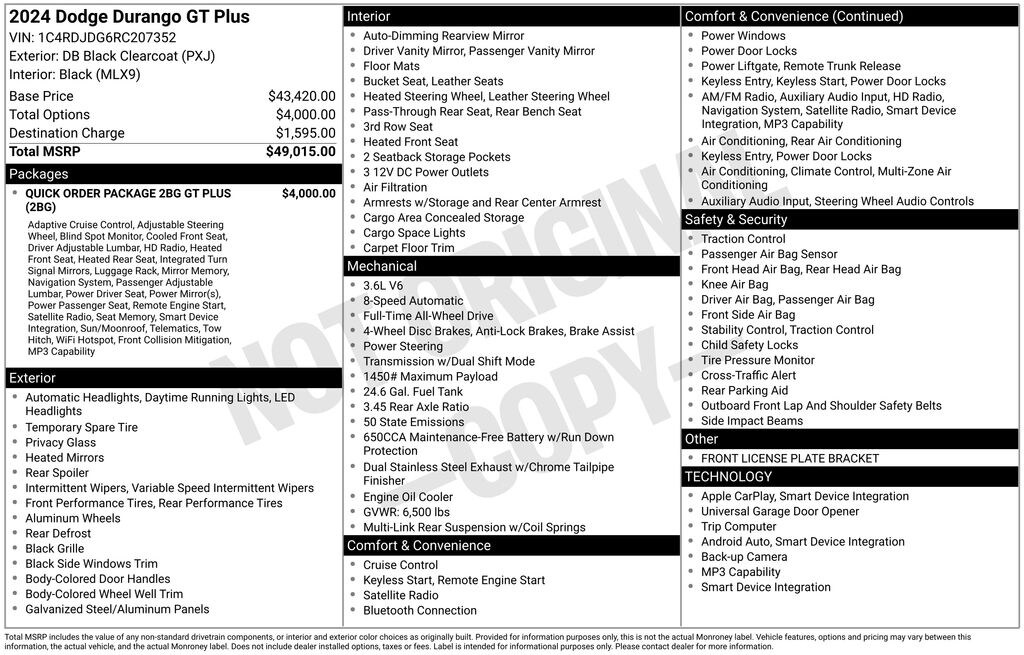 2024 Dodge Durango GT Plus Black Clearcoat AWD 3.6L V6 24V VVT 8-Speed Automatic