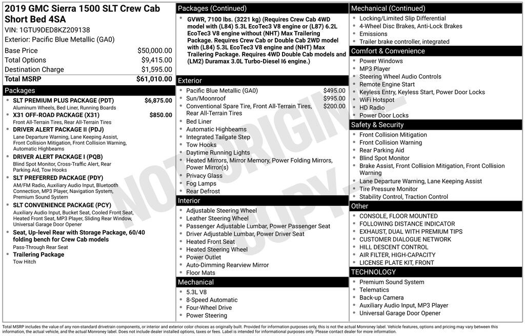 We look forward to serving you! Driver Alert Package I (Lane Change Alert w/Side Blind Zone Alert, Perimeter Lighting, Rear Cross Traffic Alert, and Ultrasonic Front & Rear Park Assist), Driver Alert Package II (Following Distance Indicator, Forward Collision Alert, Front Pedestrian Braking, IntelliBeam Automatic High Beam On/Off, Lane Keep Assist w/Lane Departure Warning, Low Speed Forward Automatic Braking, and Safety Alert Seat), Preferred Equipment Group 4SA (12-Volt Rear Auxiliary Power Outlet, 120-Volt Bed Mounted Power Outlet, 120-Volt Instrument Panel Power Outlet, 170 Amp Alternator, Auxiliary External Transmission Oil Cooler, Chrome Grille, Color-Keyed Carpeting Floor Covering, Compass, Deep-Tinted Glass, Electric Rear-Window Defogger, Electrical Lock Control Steering Column, Front Frame-Mounted Black Recovery Hooks, GMC 4G LTE, GMC Connected Access, HD Radio, Heated Driver & Front Passenger Seating, Heavy-Duty Rear Locking Differential, Hitch Guidance, Hitch Guidance w/Hitch View, In-Vehicle Trailering App, Integrated Trailer Brake Controller, Keyless Open & Start, LED Cargo Area Lighting, Manual Tilt-Wheel & Telescoping Steering Column, OnStar & GMC Connected Services Capable, Power Door Locks, Power Front Passenger Windows w/Express Up/Down, Power Front Windows w/Driver Express Up/Down, Power Rear Windows w/Express Down, Rear Dual USB Charging-Only Ports, Rear Wheelhouse Liners, Remote Vehicle Starter System, Steering Wheel Audio Controls, and Theft Deterrent System (Unauthorized Entry)), SLT Convenience Package (2 USB Ports, 2 USB Ports (1st Row), Floor Mounted Console, Front Bucket Seats, Heated 2nd Row Outboard Seats, Power Sliding Rear Window w/Rear Defogger, Universal Home Remote, and Ventilated Driver & Front Passenger Seats), SLT Preferred Package (Premium Bose 7-Speaker Sound System, Radio: Premium GMC Infotainment Sys w/Navigation, SiriusXM Radio, and Wireless Charging), SLT Premium Plus Package (Chrome Assist Steps, Spray-On Pickup Bed Liner w/GMC Logo, and Trailer Tire Pressure Monitor System), Trailering Package, X31 Off-Road Package (Dual Exhaust w/Premium Tips, High-Capacity Air Filter, Hill Descent Control, and X31 Hard Badge), 8-Speed Automatic, 4WD, Dark Walnut/Slate Leather, 10-Way Power Driver Seat Adjuster w/Lumbar, 10-Way Power Passenger Seat Adjuster w/Lumbar, 20" x 9" Polished Aluminum Wheels, 3.23 Rear Axle Ratio, 4-Wheel Disc Brakes, 6 Speakers, 6-Speaker Audio System Feature, ABS brakes, Air Conditioning, Alloy wheels, AM/FM radio: SiriusXM, Apple CarPlay/Android Auto, Auto-dimming door mirrors, Auto-dimming Rear-View mirror, Automatic temperature control, Brake assist, Bumpers: chrome, Delay-off headlights, Driver door bin, Driver Memory, Driver vanity mirror, Dual front impact airbags, Dual front side impact airbags, Electronic Stability Control, Front 40/20/40 Split-Bench Seat, Front anti-roll bar, Front Center Armrest w/Storage, Front dual zone A/C, Front fog lights, Front License Plate Kit, Front reading lights, Front wheel independent suspension, Fully automatic headlights, Heated door mirrors, Heated front seats, Heated steering wheel, Heavy Duty Suspension, Illuminated entry, Low tire pressure warning, Memory seat, Occupant sensing airbag, Outside temperature display, Overhead airbag, Overhead console, Panic alarm, Passenger door bin, Passenger vanity mirror, Perforated Leather-Appointed Seat Trim, Power door mirrors, Power driver seat, Power passenger seat, Power steering, Power Sunroof, Power windows, Premium audio system: GMC Infotainment System, Radio data system, Radio: Premium GMC Infotainment Sys w/Multi-Touch, Rear reading lights,
