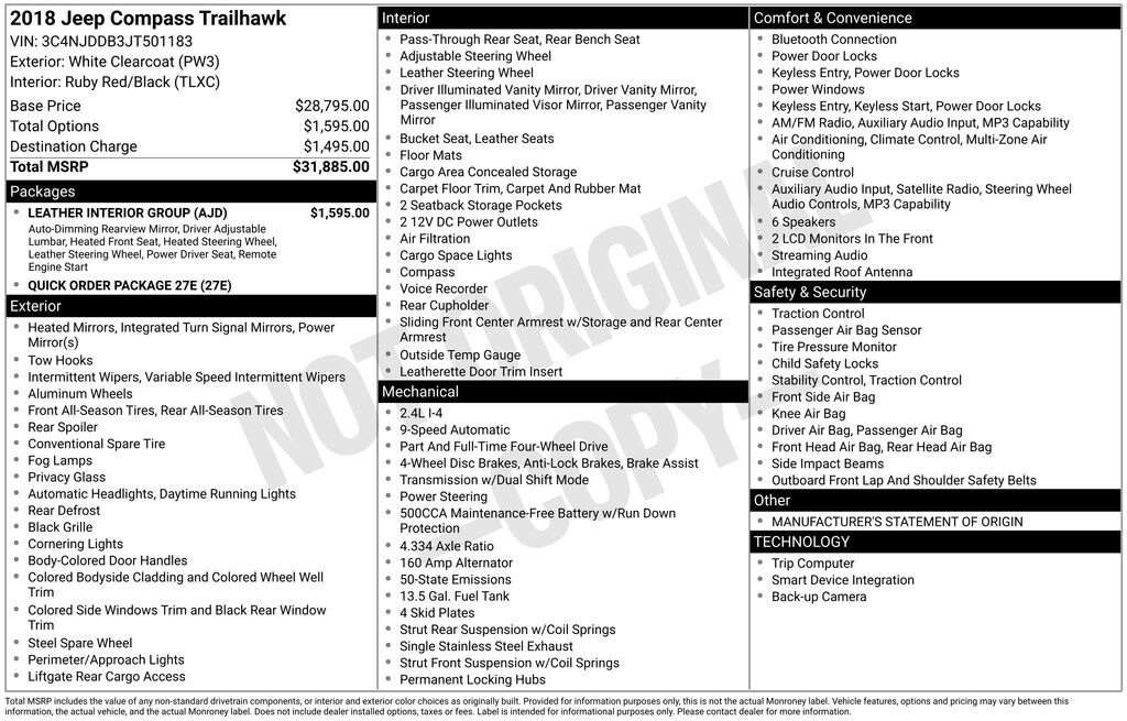 We look forward to serving you! Leather Interior Group (4-Way Power Lumbar Adjust, Auto-Dimming Rear-View Mirror, Heated Front Seats, Heated Steering Wheel, Leather w/Perforated Insert Bucket Seats, Leather Wrapped Steering Wheel, Power 8-Way Driver/Manual 6-Way Passenger Seats, Remote Start System, and Windshield Wiper De-Icer), Quick Order Package 27E, 4WD, 4-Wheel Disc Brakes, 4.334 Axle Ratio, 6 Speakers, ABS brakes, Air Conditioning, Alloy wheels, AM/FM radio: SiriusXM, Anti-whiplash front head restraints, Apple CarPlay/Android Auto, Automatic temperature control, Brake assist, Bumpers: body-color, Compass, Delay-off headlights, Driver door bin, Driver vanity mirror, Dual front impact airbags, Dual front side impact airbags, Electronic Stability Control, Four wheel independent suspension, Front anti-roll bar, Front Bucket Seats, Front Center Armrest w/Storage, Front dual zone A/C, Front fog lights, Front reading lights, Fully automatic headlights, Heated door mirrors, Illuminated entry, Knee airbag, Leather Shift Knob, Low tire pressure warning, Manufacturer's Statement of Origin, Occupant sensing airbag, Outside temperature display, Overhead airbag, Overhead console, Panic alarm, ParkView Rear Back-Up Camera, Passenger door bin, Passenger vanity mirror, Power door mirrors, Power steering, Power windows, Premium Cloth/Leather Trim Bucket Seats, Radio: Uconnect 4 w/8.4" Display, Rear anti-roll bar, Rear seat center armrest, Rear window defroster, Rear window wiper, Remote keyless entry, Roof rack: rails only, Speed control, Split folding rear seat, Spoiler, Steering wheel mounted audio controls, Tachometer, Telescoping steering wheel, Tilt steering wheel, Traction control, Trip computer, Turn signal indicator mirrors, Variably intermittent wipers, and Wheels: 17" x 6.5" Polished/Black Pockets AluminuM.