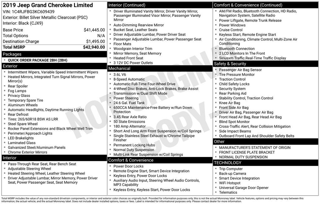 2019 Jeep Grand Cherokee Limited Billet Silver Metallic Clearcoat 4WD 3.6L V6 24V VVT 8-Speed Automatic