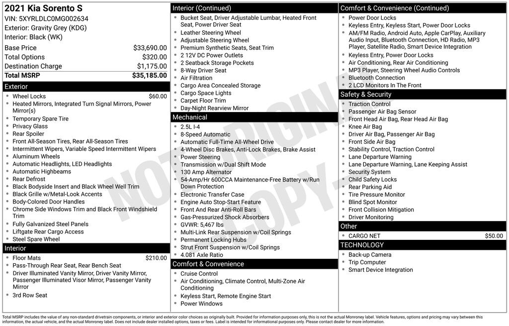 2021 Kia Sorento S Gravity Gray AWD 2.5L I4 DGI DOHC 16V LEV3-ULEV70 191hp 8-Speed Automatic