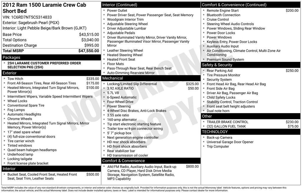 We look forward to serving you! Quick Order Package 25H Laramie, 10 Speakers, 115V Auxiliary Power Outlet, 20" x 9" Chrome Clad Aluminum Wheels, 32 Gallon Fuel Tank, 4-Wheel Disc Brakes, ABS brakes, Adjustable pedals, Air Conditioning, Alloy wheels, AM/FM radio: SIRIUS, Anti-Spin Differential Rear Axle, Audio memory, Auto-dimming door mirrors, Auto-dimming Rear-View mirror, Automatic temperature control, Brake assist, Bumpers: chrome, CD player, Center Hub, Chrome Exterior Mirrors, Class IV Receiver Hitch, Compass, Delay-off headlights, Driver door bin, Driver vanity mirror, Dual front impact airbags, Dual front side impact airbags, DVD-Audio, Electronic Stability Control, Exterior Mirrors Courtesy Lamps, Exterior Mirrors w/Heating Element, Exterior Mirrors w/Memory, Exterior Mirrors w/Supplemental Signals, Exterior Parking Camera Rear, Front anti-roll bar, Front Center Armrest w/Storage, Front dual zone A/C, Front fog lights, Front reading lights, Front wheel independent suspension, Fully automatic headlights, Garage door transmitter: HomeLink, Heated door mirrors, Heated Front Seats, Heated front seats, Heated steering wheel, Illuminated entry, Leather steering wheel, Leather Trim 40/20/40 Bench Seat, Low tire pressure warning, Memory seat, Navigation System, Occupant sensing airbag, Outside temperature display, Overhead airbag, Overhead console, Panic alarm, ParkSense Rear Park Assist System, ParkView Rear Back-Up Camera (DISC), Passenger door bin, Passenger vanity mirror, Pedal memory, Power 10-Way Memory Driver & 6-Way Passenger Seats, Power Chrome Trailer Tow Mirrors, Power door mirrors, Power driver seat, Power passenger seat, Power steering, Power windows, Radio data system, Radio: Uconnect 730N CD/DVD/MP3/HDD/NAV, Rear 60/40 Split Folding Seat, Rear anti-roll bar, Rear seat center armrest, Rear step bumper, Remote keyless entry, Remote Start System, Remote USB Port, Security system, Speed control, Split folding rear seat, Steering wheel mounted audio controls, Tachometer, Tilt steering wheel, Traction control, Trailer Brake Control, Trip computer, Turn signal indicator mirrors, Uconnect Voice Command w/Bluetooth, Variably intermittent wipers, and VoltmeteR.