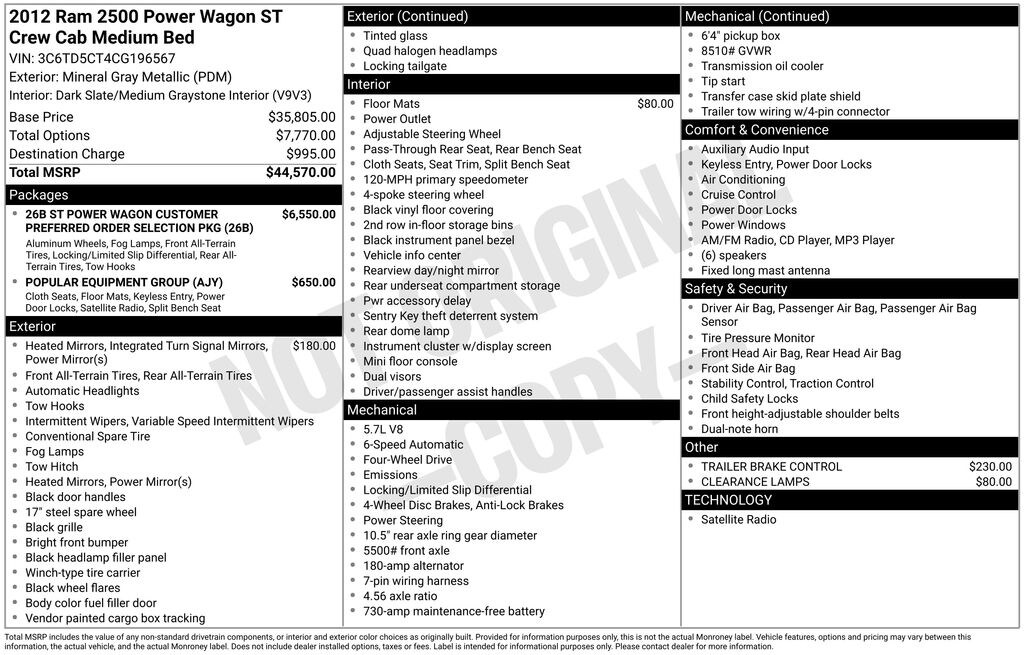 We look forward to serving you! Popular Equipment Group (40/20/40 Split Bench Seat, Carpet Floor Covering, Cloth 40/20/40 Bench Seat, Front & Rear Floor Mats, Manual Adjust Seats, Rear Folding Seat, Remote Keyless Entry, and SIRIUS Satellite Radio), Power Wagon Off-Road Group, Quick Order Package 26B Power Wagon (17" x 8" Aluminum Wheels, 180 Amp Alternator, 4.56 Rear Axle Ratio, BF Goodrich Brand Tires, Black Headlamp Filler Panel, Black Wheel Flares, Bright Front Bumper, Bright Rear Bumper, Fog Lamps, Front Disconnecting Stabilizer Bar, Front Electric Winch, Fuel Tank Skid Plate Shield, Power Wagon Tailgate Badge, Tow Hooks, and Tru-Lok Front & Rear Axles), 17" x 7.5" Steel Styled Wheels, 4-Wheel Disc Brakes, 6 Speakers, ABS brakes, Air Conditioning, AM/FM radio, Black Exterior Mirrors, Black Power Trailer Tow Mirrors, CD player, Center Hub, Clearance Lamps, Delay-off headlights, Driver door bin, Dual front impact airbags, Dual front side impact airbags, Electronic Stability Control, Exterior Mirrors Courtesy Lamps, Exterior Mirrors w/Heating Element, Exterior Mirrors w/Supplemental Signals, Front & Rear Rubber Floor Mats, Front anti-roll bar, Front Center Armrest, Fully automatic headlights, Heated door mirrors, Heavy Duty Vinyl 40/20/40 Split Bench Seat, Locking Tailgate, Low tire pressure warning, Mini Floor Console, Occupant sensing airbag, Overhead airbag, Passenger door bin, Power door mirrors, Power steering, Power windows, Radio: Uconnect 130 AM/FM/CD/MP3, Rear seat center armrest, Rear step bumper, Rear Wheel Spats, Speed control, Tachometer, Tilt steering wheel, Traction control, Trailer Brake Control, Variably intermittent wipers, and VoltmeteR.