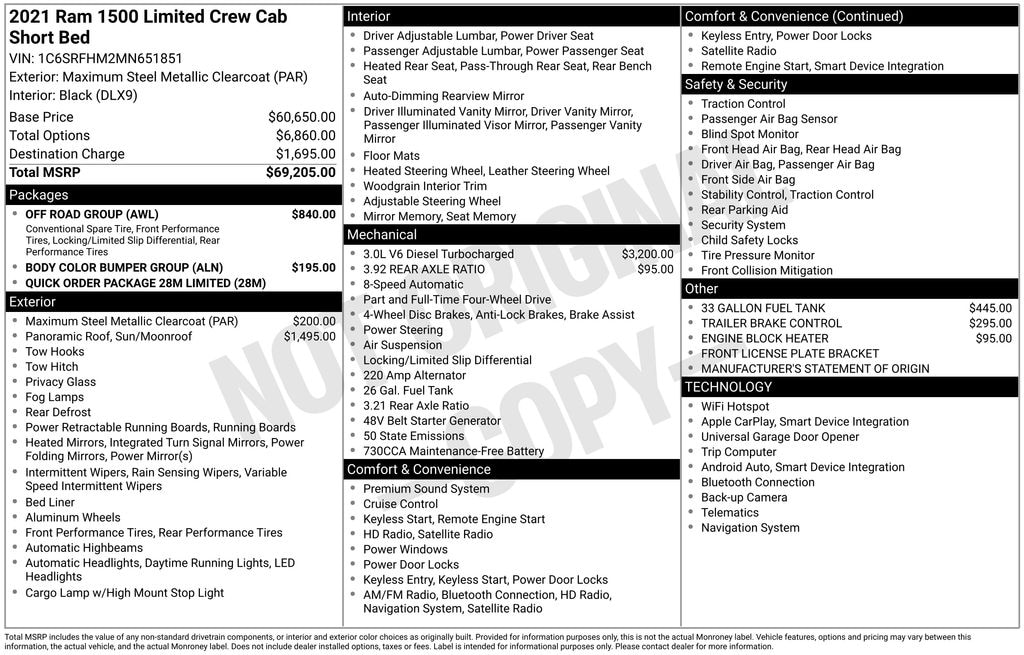 We look forward to serving you! Body Color Bumper Group, Off Road Group (E-Locker Rear Axle, Front Extra HD Shock Absorbers, Hill Descent Control, Off Road Decals, Off-Road Information Pages, and Rear Extra HD Shock Absorbers), Quick Order Package 28M Limited, 1-Yr SiriusXM Guardian Trial, 10 Speakers, 33 Gallon Fuel Tank, 4-Wheel Disc Brakes, 48V Belt Starter Generator, 4G LTE Wi-Fi Hot Spot, ABS brakes, Adjustable pedals, Air Conditioning, Alloy wheels, AM/FM radio: SiriusXM with 360L, Apple CarPlay, Apple CarPlay/Android Auto, Audio memory, Auto High-beam Headlights, Auto-dimming door mirrors, Auto-dimming Rear-View mirror, Auto-leveling suspension, Automatic temperature control, Bodyside moldings, Brake assist, Bumpers: chrome, Chrome Exterior Mirrors, Compass, Delay-off headlights, Disassociated Touchscreen Display, Dome Dual LED Reading Lamp, Driver door bin, Driver vanity mirror, Dual front impact airbags, Dual front side impact airbags, Dual-Pane Panoramic Sunroof, Electronic Stability Control, Emergency communication system: SiriusXM Guardian, Engine Block Heater, For More Info, Call 800-643-2112, Front anti-roll bar, Front Bucket Seats, Front Center Armrest w/Storage, Front dual zone A/C, Front fog lights, Front License Plate Bracket, Front reading lights, Front wheel independent suspension, Fully automatic headlights, Garage door transmitter, Genuine wood console insert, Genuine wood dashboard insert, Genuine wood door panel insert, Google Android Auto, GPS Antenna Input, GPS Navigation, HD Radio, Heated door mirrors, Heated front seats, Heated rear seats, Heated steering wheel, Illuminated entry, Integrated Center Stack Radio, Integrated Voice Command w/Bluetooth, Leather steering wheel, LED Dome/Reading Lamp, Low tire pressure warning, Manufacturer's Statement of Origin, Memory seat, Navigation System, Occupant sensing airbag, Outside temperature display, Overhead airbag, Overhead console, Panic alarm, ParkView Rear Back-Up Camera, Passenger door bin, Passenger vanity mirror, Pedal memory, Power door mirrors, Power driver seat, Power passenger seat, Power steering, Power windows, Premium Leather Trimmed Bucket Seats, Radio data system, Radio: Uconnect 12 w/Navigation, Rain sensing wipers, Rear anti-roll bar, Rear seat center armrest, Rear step bumper, Rear window defroster, Remote keyless entry, Security system, SiriusXM Radio Service, SiriusXM Satellite Radio, SiriusXM Traffic Plus, SiriusXM Travel Link, Speed control, Split folding rear seat, Steering wheel mounted audio controls, Tachometer, Telescoping steering wheel, Tilt steering wheel, Traction control, Trailer Brake Control, Trip computer, Turn signal indicator mirrors, USB Host Flip, Variably intermittent wipers, Ventilated front seats, Voltmeter, and Wheels: 20" x 9" Polished w/InsertS.
