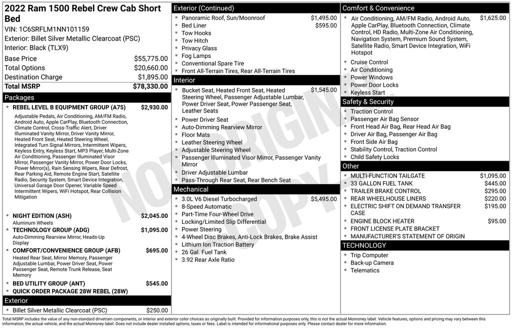 We look forward to serving you! Bed Utility Group (MOPAR 4 Adjustable Cargo Tie-Down Hooks and Pick-Up Box Lighting), Comfort/Convenience Group (Driver Seat Memory, Exterior Mirrors w/Memory, Heated Second Row Seats, Power 2-Way Passenger Lumbar Adjust, Power 8-Way Driver & Passenger Seats, Remote Tailgate Release, and Wireless Charging Pad), Night Edition (Black Front Bumper w/Black Plate, Grille Surround 2 Black Texture 3 Black, RAM Grille Badge - Black, and Wheels: 18" x 8.0" Gloss Black), Quick Order Package 28W Rebel, Rebel 12 (12" Touchscreen Display, 4 Way Front Headrests, 4G LTE Wi-Fi Hot Spot, Air Conditioning ATC w/Dual Zone Control, All R1 High Radios, All Radio Equipped Vehicles, Apple CarPlay, Bucket Seats, Connected Travel & Traffic Services, Connectivity - US/Canada, Disassociated Touchscreen Display, For Details, Visit DriveUconnect.com, Front Seat Back Map Pockets, Full Length Upgraded Floor Console, Global Telematics Box Module (TBM), Google Android Auto, GPS Antenna Input, GPS Navigation, harman/kardon 19 Speaker Premium Sound, HD Radio, Heated Front Seats, Heated Steering Wheel, Integrated Center Stack Radio, Integrated Voice Command w/Bluetooth, LED Footwell Lighting, Lux Leather Trimmed Bucket Seats, Off-Road Information Pages, Power 2-Way Driver Lumbar Adjust, Radio: Uconnect 5 Nav w/12.0" Display, Rear 60/40 Folding Seat, SiriusXM Radio Service, SiriusXM w/360L, and USB Host Flip), Rebel Level B Equipment Group (DISC) (115V Auxiliary Rear Power Outlet, 2-Door Passive Entry, Front Door Locks, 8.4" Touchscreen Display, Auto-Dimming Exterior Driver Mirror, Black Premium Power Mirrors (GUL), Bluetooth Handsfree Phone & Audio, Body Color Door Handles, Exterior Mirrors Courtesy Lamps, Exterior Mirrors w/Supplemental Signals, Foam Bottle Insert (Door Trim Panel), For More Info, Call 800-643-2112, Media Hub w/2 Charge Only USBs, ParkSense Front/Rear Park Assist w/Stop, Power Adjustable Pedals, Radio: Uconnect 5 W w/8.4" Display, Rain Sensitive Windshield Wipers, Rear Dome w/On/Off Switch Lamp, Rear Underseat Compartment Storage, Rear Window Defroster, Remote Start System, Security Alarm, SiriusXM Satellite Radio, Sun Visors w/Illuminated Vanity Mirrors, and Universal Garage Door Opener), Technology Group (Digital Rearview Mirror, Heads-Up Display, and LED CHMSL Lamp), 2nd Row In Floor Storage Bins, 3.92 Rear Axle Ratio, 33 Gallon Fuel Tank, 4-Wheel Disc Brakes, 48V Belt Starter Generator, 6 Speakers, ABS brakes, Air Conditioning, Alloy wheels, AM/FM radio: SiriusXM, Auto-dimming Rear-View mirror, Black Exterior Mirrors, Brake assist, Cloth/Vinyl Low Back Bucket Seats, Compass, Convex Wide-Angle Mirror Insert, Delay-off headlights, Dome Dual LED Reading Lamp, Driver door bin, Dual front impact airbags, Dual front side impact airbags, Dual-Pane Panoramic Sunroof, Electric Shift-On-Demand Transfer Case, Electronic Stability Control, Emergency communication system: SiriusXM Guardian, Engine Block Heater, Front anti-roll bar, Front Bucket Seats, Front Center Armrest w/Storage, Front fog lights, Front License Plate Bracket, Front reading lights, Front wheel independent suspension, Fully automatic headlights, Heated door mirrors, Illuminated entry, Leather steering wheel, Low tire pressure warning, Manufacturer's Statement of Origin, MOPAR Spray In Bedliner, Multi-Function Tailgate, Occupant sensing airbag, Outside temperature display, Overhead airbag, Overhead console, Overhead LED Lamps, Panic alarm, ParkView Rear Back-Up Camera, Passenger door bin, Passenger vanity mirror, Power door mirrors, Power driver seat, Power steering, Power windows, Premium O