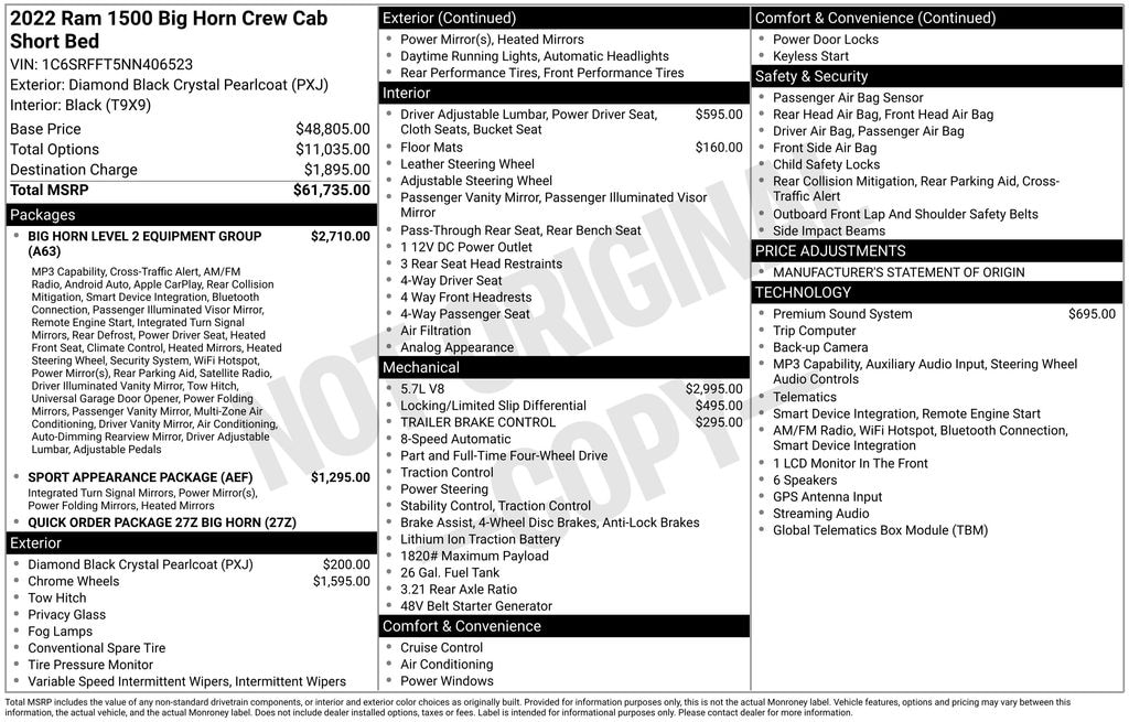 We look forward to serving you! Big Horn Level 2 Equipment Group (115V Auxiliary Power Outlet, 115V Auxiliary Rear Power Outlet, 2nd Row In Floor Storage Bins, 400W Inverter, 4G LTE Wi-Fi Hot Spot, 8.4" Touchscreen Display, Air Conditioning ATC w/Dual Zone Control, Apple CarPlay, Auto-Dimming Exterior Driver Mirror, Auto-Dimming Rear-View Mirror, Black Exterior Mirrors, Black Premium Power Mirrors, Bluetooth Handsfree Phone & Audio, Class IV Receiver Hitch, Cluster 7.0" TFT Color Display, Connectivity - US/Canada, Convex Wide-Angle Mirror Insert, Exterior Mirrors Courtesy Lamps, Exterior Mirrors w/Heating Element, Exterior Mirrors w/Supplemental Signals, For Details, Visit DriveUconnect.com, Global Telematics Box Module (TBM), Glove Box Lamp, Google Android Auto, GPS Antenna Input, Heated Front Seats, Heated Steering Wheel, Integrated Center Stack Radio, Media Hub w/2 Charge Only USBs, ParkSense Front/Rear Park Assist w/Stop, Power 2-Way Driver Lumbar Adjust, Power 8-Way Driver Seat, Power Adjustable Pedals, Power-Folding Mirrors, Radio: Uconnect 5 W w/8.4" Display, Rear Dome w/On/Off Switch Lamp, Rear Power Sliding Window, Rear Window Defroster, Remote Start System, Security Alarm, SiriusXM Radio Service, SiriusXM Satellite Radio, Sun Visors w/Illuminated Vanity Mirrors, Universal Garage Door Opener, and USB Host Flip), Quick Order Package 27Z Big Horn (Big Horn Badge), Sport Appearance Package (3 Rear Seat Head Restraints, 4 Way Front Headrests, All Plant-Installed Decals, Black Interior Accents, Body Color Exterior Mirrors, Body Color Front Bumper, Body Color Premium Power Mirrors, Body Color Rear Bumper w/Step Pads, Bridgestone Brand Tires, Bucket Seats, Delete LED Lamp - Floor Console Bin, Deluxe Cloth Bucket Seats, Front Seat Back Map Pockets, Full Length Floor Console, Manual Adjust 4-Way Front Passenger Seat, Rear 60/40 Folding Seat, Rear Center Armrest, and Sport Decal), 3.21 Rear Axle Ratio, 4-Wheel Disc Brakes, 48V Belt Starter Generator, 6 Speakers, 9 Amplified Speakers w/Subwoofer, ABS brakes, Air Conditioning, Alloy wheels, AM/FM radio, Anti-Spin Differential Rear Axle, Brake assist, Bumpers: chrome, Cloth Bench Seat, Compass, Delay-off headlights, Driver door bin, Dual front impact airbags, Dual front side impact airbags, Electronic Stability Control, Emergency communication system: SiriusXM Guardian, Front anti-roll bar, Front Center Armrest w/Storage, Front fog lights, Front License Plate Bracket, Front reading lights, Front wheel independent suspension, Fully automatic headlights, Heated door mirrors, Illuminated entry, Integrated Voice Command w/Bluetooth, Leather steering wheel, Low tire pressure warning, Manufacturer's Statement of Origin, MOPAR Front & Rear Rubber Floor Mats, Occupant sensing airbag, Outside temperature display, Overhead airbag, Overhead console, Panic alarm, ParkView Rear Back-Up Camera, Passenger door bin, Passenger vanity mirror, Power door mirrors, Power steering, Power windows, Radio data system, Radio: Uconnect 3 w/5" Display, Rear anti-roll bar, Rear seat center armrest, Rear step bumper, Remote keyless entry, Speed control, Split folding rear seat, Steering wheel mounted audio controls, Tachometer, Telescoping steering wheel, Tilt steering wheel, Traction control, Trailer Brake Control, Trip computer, Variably intermittent wipers, Voltmeter, Wheels: 18" x 8" Cast-Aluminum Painted, and Wheels: 20" x 9" Aluminum Chrome Clad (WRK)