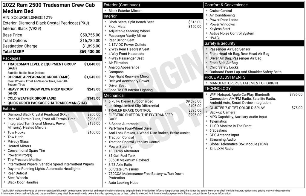 We look forward to serving you! Chrome Appearance Group (Bright Front Bumper, Bright Rear Bumper, Center Hub, Chrome Grille Surround, Matte Black Mesh Grille w/Chrome, and Wheels: 18" x 8.0" Steel Chrome Clad), Cold Weather Group (Engine Block Heater and MOPAR Winter Front Grille Cover), Heavy Duty Snow Plow Prep Group (220 Amp Alternator), Quick Order Package 2HA Tradesman, Tradesman Level 2 Equipment Group (2 Way Rear Headrest Seat, 4 Way Front Headrests, 40/20/40 Split Bench Seat, Carpet Floor Covering, Cloth 40/20/40 Bench Seat, Front Armrest w/Cupholders, Manual Adjust 4-Way Driver Seat, Manual Adjust 4-Way Front Passenger Seat, Rear Folding Seat, Rear Power Sliding Window, Rear Window Defroster, SiriusXM Satellite Radio, and Storage Tray), 17" x 7.5" Steel Styled Wheels, 3.73 Axle Ratio, 4-Wheel Disc Brakes, 4G LTE Wi-Fi Hot Spot, 6 Speakers, 8.4" Touchscreen Display, ABS brakes, Active Noise Control System, Air Conditioning, All R1 Low Radios, All Radio Equipped Vehicles, AM/FM radio, Anti-Spin Differential Rear Axle, Apple CarPlay, Black Exterior Mirrors, Bluetooth Handsfree Phone & Audio, Brake assist, Cluster 3.5" TFT Color Display, Cluster 7.0" TFT Color Display, Compass, Connectivity - US/Canada, Delay-off headlights, Driver door bin, Dual front impact airbags, Dual front side impact airbags, Electric Shift-On-The-Fly Transfer Case, Electronic Stability Control, Electronically Controlled Throttle, Emergency communication system: SiriusXM Guardian, Exterior Mirrors Courtesy Lamps, Exterior Mirrors w/Heating Element, Exterior Mirrors w/Supplemental Signals, For Details, Visit DriveUconnect.com, Front anti-roll bar, Front Center Armrest w/Storage, Front License Plate Bracket, Front reading lights, Fully automatic headlights, Global Telematics Box Module (TBM), Google Android Auto, GPS Antenna Input, Heated door mirrors, Heavy Duty Vinyl 40/20/40 Split Bench Seat, Illuminated entry, Integrated Center Stack Radio, Integrated Voice Command w/Bluetooth, Low tire pressure warning, Manufacturer's Statement of Origin, Mirror Running Lights, Occupant sensing airbag, Outside temperature display, Overhead airbag, Overhead console, ParkView Rear Back-Up Camera, Passenger door bin, Passenger vanity mirror, Power Adjust & Heated Black Tow Mirrors, Power door mirrors, Power steering, Power windows, Radio data system, Radio: Uconnect 3 w/5" Display, Radio: Uconnect 5 W w/8.4" Display, Rear anti-roll bar, Rear step bumper, Selectable Tire Fill Alert, SiriusXM Radio Service, Speed control, Tachometer, Tilt steering wheel, Tip Start, Tow Hooks, Traction control, Trailer Brake Control, Trailer Light Check, Trailer Tow Mirrors, Variably intermittent wipers, Vendor Painted Cargo Box, Vendor Painted Cargo Box Tracking, and VoltmeteR.