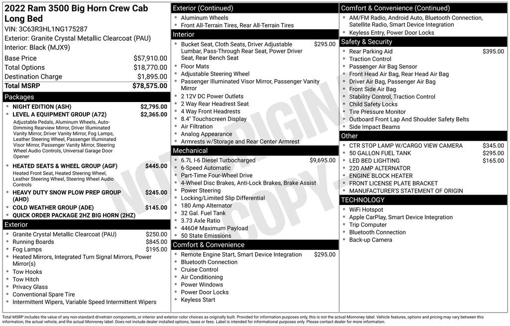 We look forward to serving you! Cold Weather Group (Engine Block Heater), Heated Seats & Wheel Group (Heated Front Seats, Leather Wrapped Steering Wheel, and Steering Wheel Mounted Audio Controls), Heavy Duty Snow Plow Prep Group (220 Amp Alternator), Level An Equipment Group (2 Way Rear Headrest Seat, 4 Way Front Headrests, 40/20/40 Split Bench Seat, Auto-Dimming Rear-View Mirror, Center Hub, Center Stack Storage Drawer, Dual Glove Boxes, Foam Bottle Insert (Door Trim Panel), Folding Flat Load Floor Storage, Footwell Courtesy Lamp, Front Armrest w/Cupholders, Front Center Seat Cushion Storage, Front Fog Lamps, Glove Box Lamp, Locking Lower Glove Box, Manual Adjust 4-Way Front Passenger Seat, Power 2-Way Driver Lumbar Adjust, Power Adjustable Pedals, Premium Cloth 40/20/40 Bench Seat, Rear 60/40 Folding Seat, Storage Tray, and Wheels: 18" x 8.0" Polished Aluminum), Night Edition (Black Headlamp Bezels, Black Ram Head Tailgate Badge, Black Wheel Center Hub, Body Color Door Handles, Grille-Gloss Black Nostrils/Molded in Color Black, and ParkSense Front/Rear Park Assist System), Quick Order Package 2HZ Big Horn, 3.73 Axle Ratio, 4-Wheel Disc Brakes, 4G LTE Wi-Fi Hot Spot, 50 Gallon Fuel Tank, 6 Speakers, 8.4" Touchscreen Display, ABS brakes, Active Noise Control System, Air Conditioning, AM/FM radio: SiriusXM, Apple CarPlay, Apple CarPlay/Android Auto, Bluetooth Handsfree Phone & Audio, Brake assist, Bumpers: chrome, Cloth 40/20/40 Bench Seat, Compass, Connectivity - US/Canada, CTR Stop Lamp w/Cargo View Camera, Delay-off headlights, Driver door bin, Dual front impact airbags, Dual front side impact airbags, Electronic Stability Control, Electronically Controlled Throttle, For More Info, Call 800-643-2112, Front anti-roll bar, Front Center Armrest w/Storage, Front License Plate Bracket, Front reading lights, Fully automatic headlights, Global Telematics Box Module (TBM), GPS Antenna Input, Heated door mirrors, Illuminated entry, Integrated Voice Command w/Bluetooth, LED Bed Lighting, Low tire pressure warning, Manual Adjust 4-Way Driver Seat, Manufacturer's Statement of Origin, Occupant sensing airbag, Outside temperature display, Overhead airbag, Overhead console, Painted Flat Wheel-to-Wheel Side Steps, Panic alarm, ParkView Rear Back-Up Camera, Passenger door bin, Passenger vanity mirror, Power door mirrors, Power steering, Power windows, Radio data system, Radio: Uconnect 5 w/8.4" Display, Rear Folding Seat, Rear seat center armrest, Rear step bumper, Remote keyless entry, Remote Start System, Selectable Tire Fill Alert, SiriusXM Radio Service, SiriusXM Satellite Radio, Speed control, Tachometer, Tilt steering wheel, Tip Start, Traction control, Trip computer, Turn signal indicator mirrors, Variably intermittent wipers, Voltmeter, Wheels: 18" x 8.0" Steel Chrome Clad, and Wheels: 20" x 8.0" Black Painted AluminuM.