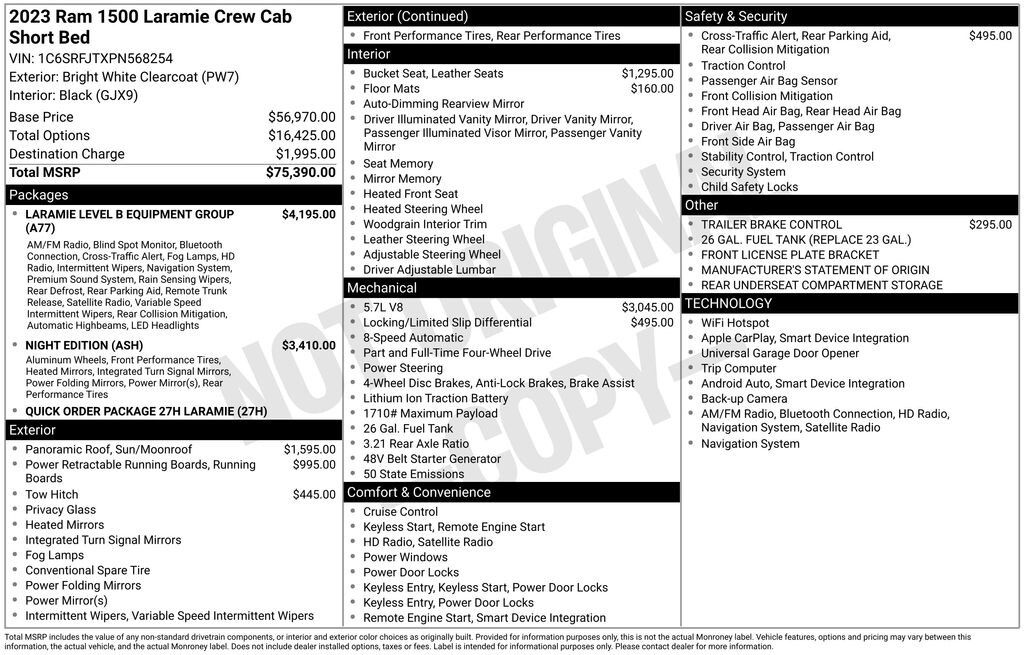 We look forward to serving you! Laramie Level B Equipment Group (12" Touchscreen Display, 2nd Row In Floor Storage Bins, 4G LTE Wi-Fi Hot Spot, Apple CarPlay, Auto High Beam Headlamp Control, Blind Spot & Cross Path Detection, Connected Travel & Traffic Services, Connectivity - US/Canada, Disassociated Touchscreen Display, Electric Shift-On-Demand Transfer Case, Foam Bottle Insert (Door Trim Panel), For Details, Visit DriveUconnect.com, For More Info, Call 800-643-2112, Front Door Accent Lighting, Front LED Fog Lamps, Global Telematics Box Module (TBM), Google Android Auto, GPS Antenna Input, GPS Navigation, harman/kardon 19 Speaker Premium Sound, HD Radio, Integrated Center Stack Radio, Integrated Voice Command w/Bluetooth, LED Reflector Headlamps, Radio: Uconnect 5 Nav w/12.0" Display, Rain Sensitive Windshield Wipers, Rear Door Accent Lighting, Rear Power Sliding Window, Rear Underseat Compartment Storage, Rear Window Defroster, Remote Tailgate Release, SiriusXM Radio Service, SiriusXM w/360L, and USB Host Flip), Night Edition (#1 Seat Foam Cushion, 3 Rear Seat Head Restraints, 4 Way Front Headrests, Accent Color Door Handles, Accent Color Premium Power Mirrors, Auto-Dimming Exterior Driver Mirror, Black Exterior Truck Badging, Black Headlamp Bezels, Black Interior Accents, Black Painted Exterior Mirrors Caps, Body Color Front Bumper, Body Color Rear Bumper w/Step Pads, Bucket Seats, Center Console Parts Module, Convex Wide-Angle Exterior Mirror Insert, Driver Seat Memory, Dual Exhaust w/Black Tips, Exterior Mirrors Courtesy Lamps, Exterior Mirrors w/Heating Element, Exterior Mirrors w/Memory, Exterior Mirrors w/Supplemental Signals, Front Seat Back Map Pockets, Full Length Upgraded Floor Console, Grille Surround 3 Black Texture 2 Black, Heated Front Seats, Heated Steering Wheel, Leather Trimmed Bucket Seats, Power 2-Way Driver Lumbar Adjust, Power 2-Way Passenger Lumbar Adjust, Power 8-Way Driver & Passenger Seats, Power-Folding Mirrors, RAM Grille Badge - Black, Rear 60/40 Folding Seat, Sport Performance Hood, Ventilated Front Seats, and Wheels: 22" x 9" Forged Aluminum), Quick Order Package 27H Laramie, 10 Speakers, 26 Gal. Fuel Tank (Replace 23 Gal.), 3.21 Rear Axle Ratio, 4-Wheel Disc Brakes, 48V Belt Starter Generator, ABS brakes, Adjustable pedals, Air Conditioning, Alloy wheels, AM/FM radio: SiriusXM with 360L, Anti-Spin Differential Rear Axle, Apple CarPlay/Android Auto, Audio memory, Auto-dimming door mirrors, Auto-dimming Rear-View mirror, Automatic temperature control, Brake assist, Bumpers: chrome, Chrome Exterior Mirrors, Class IV Receiver Hitch, Compass, Delay-off headlights, Dome Dual LED Reading Lamp, Driver door bin, Driver vanity mirror, Dual front impact airbags, Dual front side impact airbags, Dual-Pane Panoramic Sunroof, Electronic Stability Control, Front anti-roll bar, Front Center Armrest w/Storage, Front dual zone A/C, Front fog lights, Front License Plate Bracket, Front reading lights, Front wheel independent suspension, Fully automatic headlights, Garage door transmitter, Heated door mirrors, Heated front seats, Heated steering wheel, Illuminated entry, Leather steering wheel, Leather Trim 40/20/40 Bench Seat, LED Dome/Reading Lamp, Low tire pressure warning, Manufacturer's Statement of Origin, Memory seat, MOPAR Front & Rear Rubber Floor Mats, Navigation System, Occupant sensing airbag, Outside temperature display, Overhead airbag, Overhead console, Panic alarm, ParkSense Front/Rear Park Assist w/Stop (DISC), ParkView Rear Back-Up Camera, Passenger door bin, Passenger vanity mirror, Pedal memory, Power door mirrors, Power driver seat, Power passenger seat, Power Running Boards, Power stee