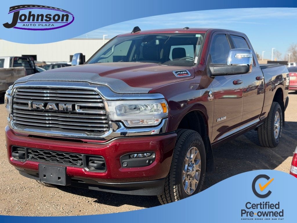 We look forward to serving you! Cold Weather Group (Engine Block Heater and MOPAR Winter Front Grille Cover), Laramie Level 1 Equipment Group (12" Touchscreen Display, 2nd Row In Floor Storage Bins, 4G LTE Wi-Fi Hot Spot, Alexa Built-In, Apple CarPlay, Auto Adjust In Reverse Exterior Mirrors, Auto Dim Exterior Mirror, Auto High Beam Headlamp Control, Auto Power-Folding Mirrors, Auto-Dimming Exterior Passenger Mirror, Blind Spot & Cross Path Detection, Center Hub, Chrome Exterior Mirrors, Connected Travel & Traffic Services, Connectivity - US/Canada, Disassociated Touchscreen Display, Exterior Mirrors Courtesy Lamps, Exterior Mirrors w/Heating Element, Exterior Mirrors w/Memory, Exterior Mirrors w/Supplemental Signals, Foam Bottle Insert (Door Trim Panel), For Details, Visit DriveUconnect.com, For More Info, Call 800-643-2112, Forward & Reverse Utility Lights, Front LED Fog Lamps, Global Telematics Box Module (TBM), Google Android Auto, GPS Antenna Input, GPS Navigation, HD Radio, Integrated Voice Command w/Bluetooth, LED Reflector Headlamps, LED Tail Lamps, Mirror Running Lights, Off-Road Information Pages, ParkSense Front/Rear Park Assist System, Power Adjust Mirrors, Power Adjustable Convex Aux Mirrors, Power Adjustable Pedals w/Memory, Power Heated Fold Telescopic Mirrors w/Memory, Power Telescoping Mirrors, Radio: Uconnect 5 Nav w/12.0" Display, Rain Sensitive Windshield Wipers, Rear Power Sliding Window, Rear Window Defroster, Remote Tailgate Release, Selectable Tire Fill Alert, SiriusXM Radio Service, SiriusXM w/360L, Trailer Tow Pages, and Wheels: 18" x 8.0" Polished Aluminum), Protection Group (Tow Hooks), Quick Order Package 2HH Laramie, FCA US LLC Certified Pre-Owned Certified, 10 Speakers, 115V Auxiliary Rear Power Outlet, 2 Way Rear Headrest Seat, 220 Amp Alternator, 3.73 Axle Ratio, 4 Way Front Headrests, 4-Wheel Disc Brakes, 5th Wheel/Gooseneck Towing Prep Group, ABS brakes, Active Noise Control System, Air Conditioning, Alloy wheels, AM/FM radio: SiriusXM with 360L, Anti-Spin Differential Rear Axle, Apple CarPlay/Android Auto, Automatic temperature control, Brake assist, Bumpers: body-color, Compass, CTR Stop Lamp w/Cargo View Camera, Delay-off headlights, Driver door bin, Driver vanity mirror, Dual front impact airbags, Dual front side impact airbags, Electronic Stability Control, Electronically Controlled Throttle, Front anti-roll bar, Front Center Armrest w/Storage, Front dual zone A/C, Front License Plate Bracket, Front reading lights, Front Seat Back Map Pockets, Fully automatic headlights, Garage door transmitter, Heated door mirrors, Heated Front Seats, Heated front seats, Heated Steering Wheel, Heated steering wheel, Illuminated entry, Leather steering wheel, Leather Trim 40/20/40 Bench Seat, Low tire pressure warning, Manufacturer's Statement of Origin, MOPAR Front & Rear Rubber Floor Mats, Navigation System, Occupant sensing airbag, Outside temperature display, Overhead