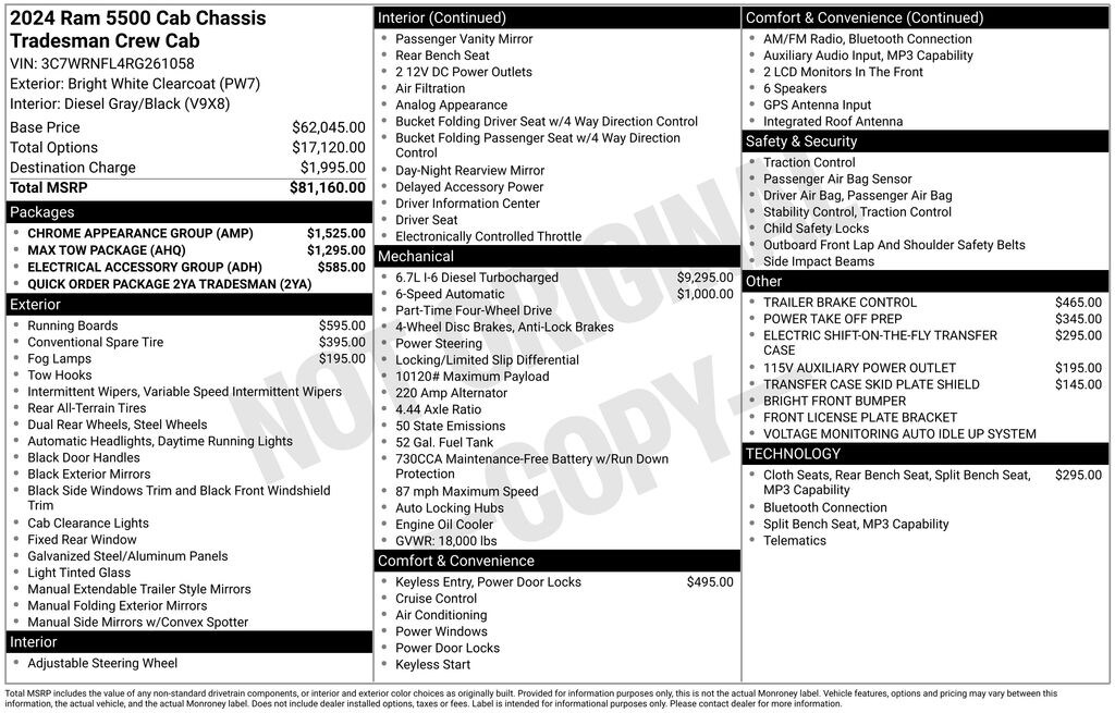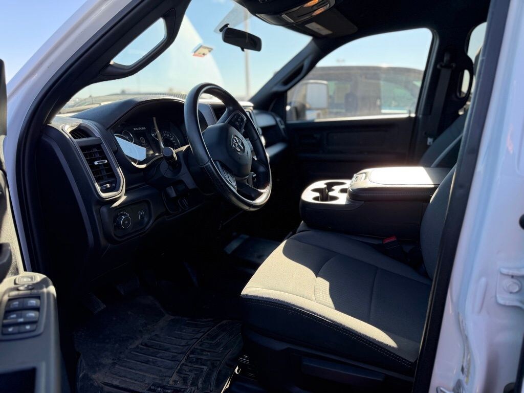 We look forward to serving you! Chrome Appearance Group (Bright Front Bumper, Center Hub, Chrome Grille Surround, Chrome Headlamp Bezels, and Matte Black Mesh w/Chrome Grille), Electrical Accessory Group (Voltage Monitoring Auto Idle Up System), Max Tow Package, Quick Order Package 2YA Tradesman (Black Exterior Truck Badging, Black Key Fob, Black Wheel Flares, Door Sill Scuff Pads, Glove Box, Halogen Quad Headlamps, Map/Courtesy Lamp, Matte Black Grille Surround, Overhead Console, Overhead Cupholder Lamp, and Rear Dome Lamp), 115V Auxiliary Power Outlet, 19.5" x 6.0" Steel Wheels, 4-Wheel Disc Brakes, 40/20/40 Split Bench Seat, 400W Inverter, 6 Speakers, 87 mph Maximum Speed, ABS brakes, Air Conditioning, Black Exterior Mirrors, Chrome Tubular Side Steps, Compass, Delay-off headlights, Driver door bin, Dual front impact airbags, Dual rear wheels, Electric Shift-On-The-Fly Transfer Case, Electronic Stability Control, Electronically Controlled Throttle, Emergency communication system: SiriusXM Guardian, For Details, Visit DriveUconnect.com, For More Info, Call 800-643-2112, Front anti-roll bar, Front Bucket Seats, Front Fog Lamps, Front License Plate Bracket, Front reading lights, Fully automatic headlights, Global Telematics Box Module (TBM), GPS Antenna Input, HD Vinyl 40/20/40 Split Bench Seat, Integrated Voice Command w/Bluetooth, Manual Adjust 4-Way Driver Seat, Manual Adjust 4-Way Front Passenger Seat, Manual Folding Exterior Mirrors, Occupant sensing airbag, Outside temperature display, Passenger door bin, Passenger vanity mirror, Power steering, Power windows, Radio data system, Radio: Uconnect 3 w/5" Display, Rear anti-roll bar, Rear Folding Seat, Remote Keyless Entry, Remote USB Port - Charge Only, SiriusXM Radio Service, Speed control, Storage Tray, Tachometer, Temperature & Compass Gauge, Tilt steering wheel, Traction control, Trailer Brake Control, Trailer Light Check, Variably intermittent wipers, and VoltmeteR.